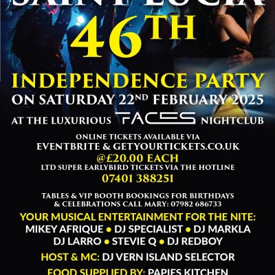 Saint Lucia Independence Party - Limited £15 Ticket - £15.00 Celebrate Saint Lucia's 46th Independence in style! This £15 limited ticket grants you entry to an unforgettable night of Soca, Reggae, Soul, Afrobeats, Zouk, and more at Faces Nightclub on Saturday, 22nd February 2025. Saint Lucia Independence Party - Limited £15 Ticket - £15.00 Celebrate Saint Lucia's 46th Independence in style! This £15 limited ticket grants you entry to an unforgettable night of Soca, Reggae, Soul, Afrobeats, Zouk, and more at Faces Nightclub on Saturday, 22nd February 2025.